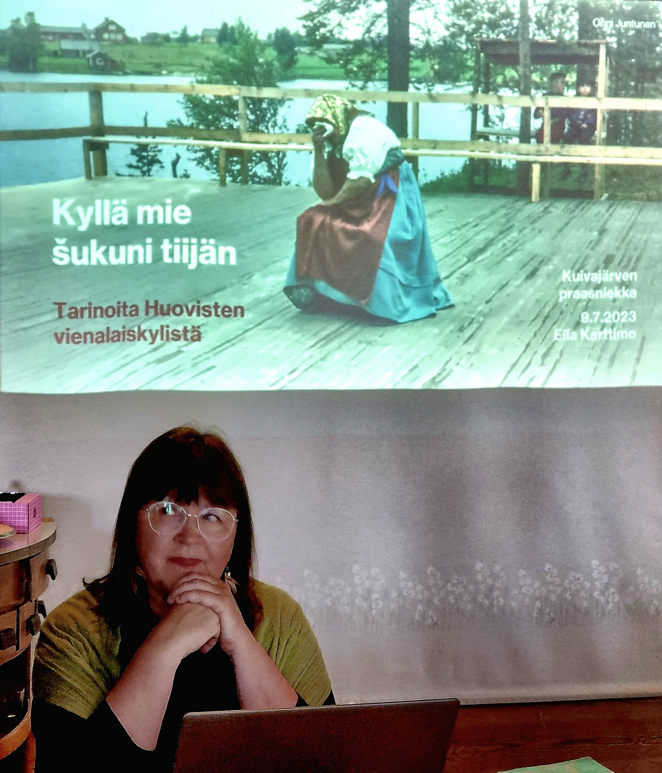 Ella Karttimo esitteli uutta kyläkirjaa ”Kyllä mie sukuni tiijän” -tarinoita Huovisten vienalaiskylistä. Kirja ilmestyy vuonna 2024. Lisätietoja pj Markus Huovinen markus.m.huovinen@gmail.com tai puh. 0400 169 825.